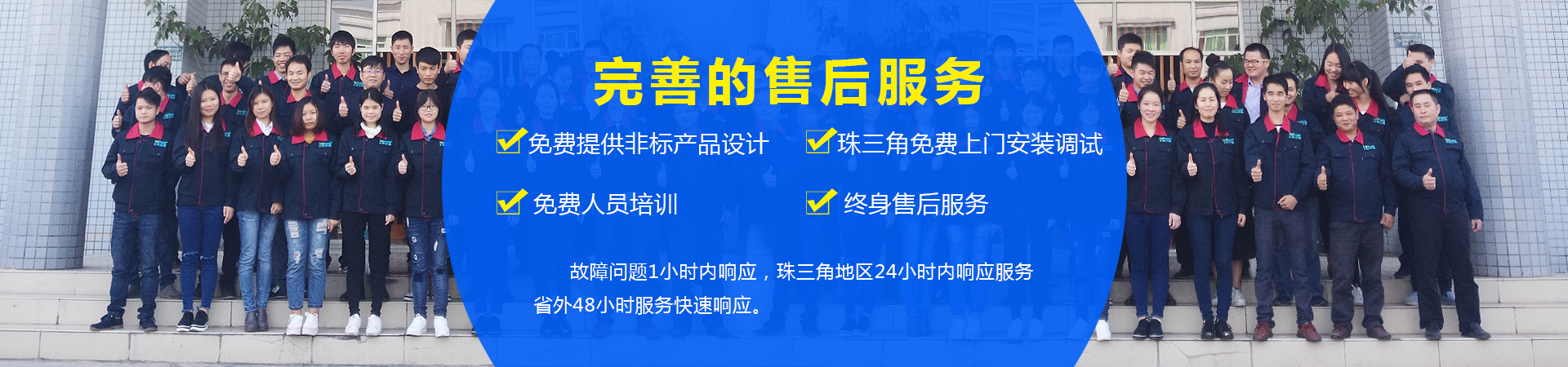 專業技術人員上門交機培訓,指導機器操作,并培訓機器后續維護保養,提高機器使用壽命,一年免費保修維護,專業的售后團隊,保證故障問題1小時內響應,珠三角地區24小時內上門,廣東省外48小時內上門。